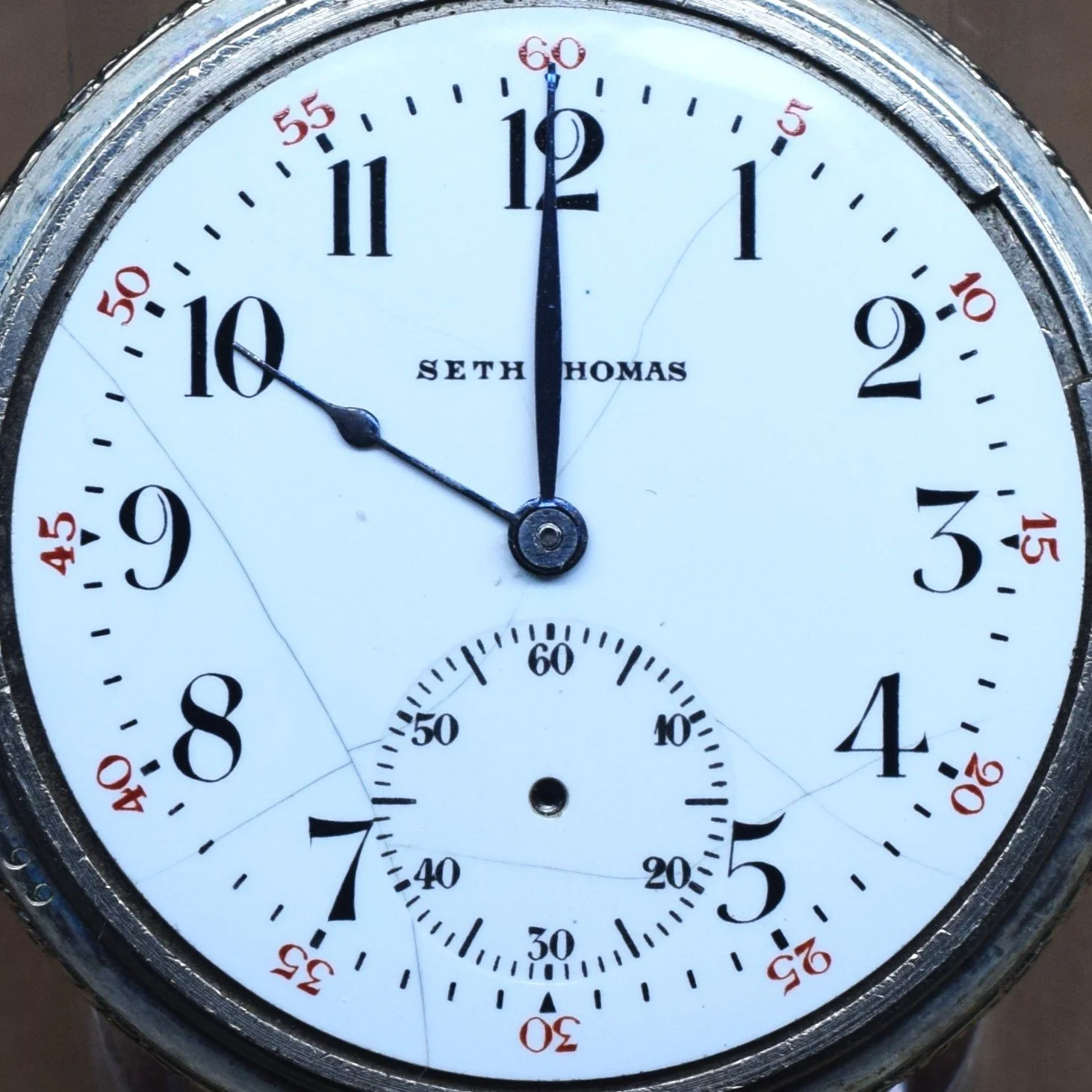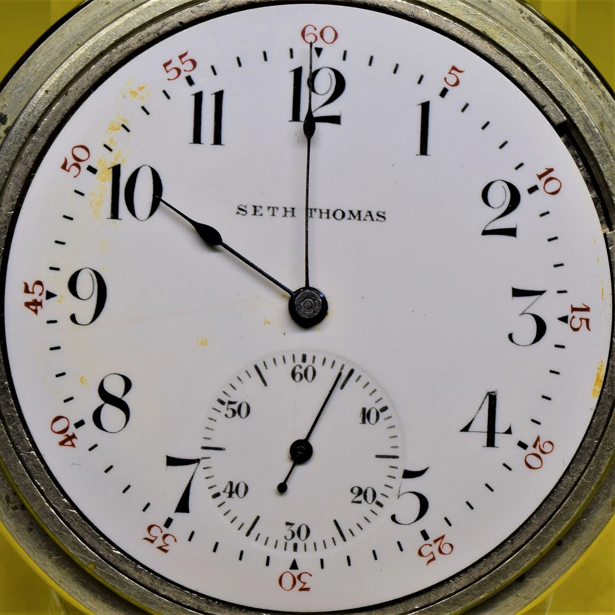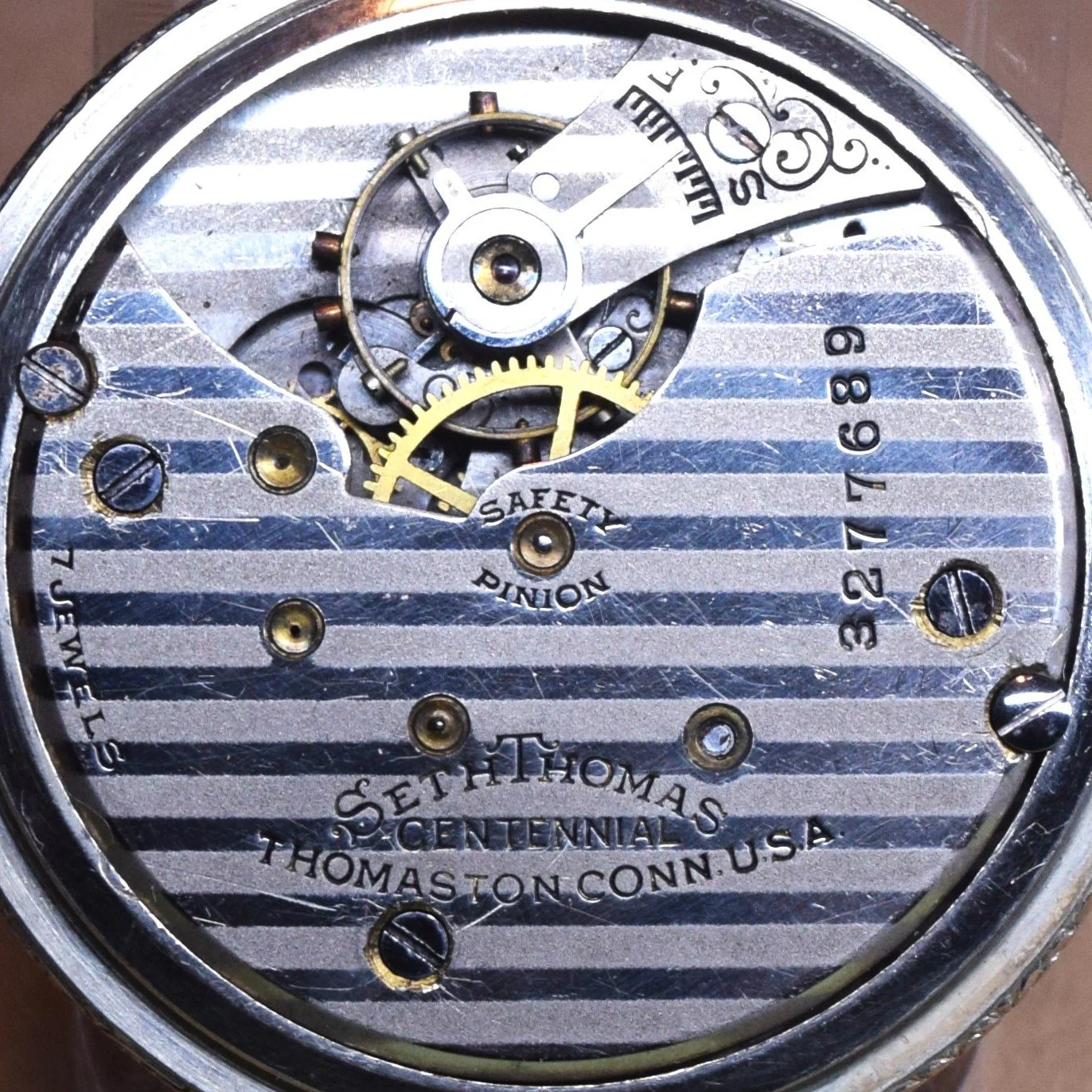 This 1912 Seth Thomas 12-size hunting Model 22 pocket watch was manufactured with a nickel finished 3/4 plate, 7 jewels, and it is non-adjusted. The movement is stem wound and pendant set, with a Breguet hair spring, and plain/simple regulator. Its serial number is 3277689, and its grade is Seth Thomas named grade Centennial. The movement is signed “Seth Thomas Centennial Thomaston, Conn.”.