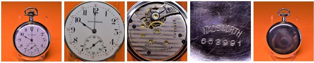 The movement is cased in a 12-size Wadsworth Watch Case Company open-face nickel pocket watch case with screw back and bezel, serial number 653991.