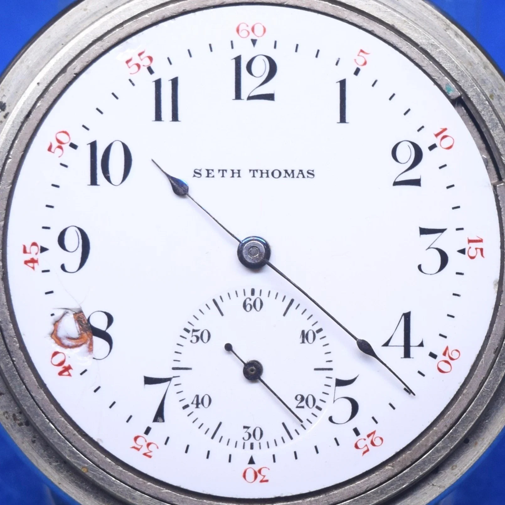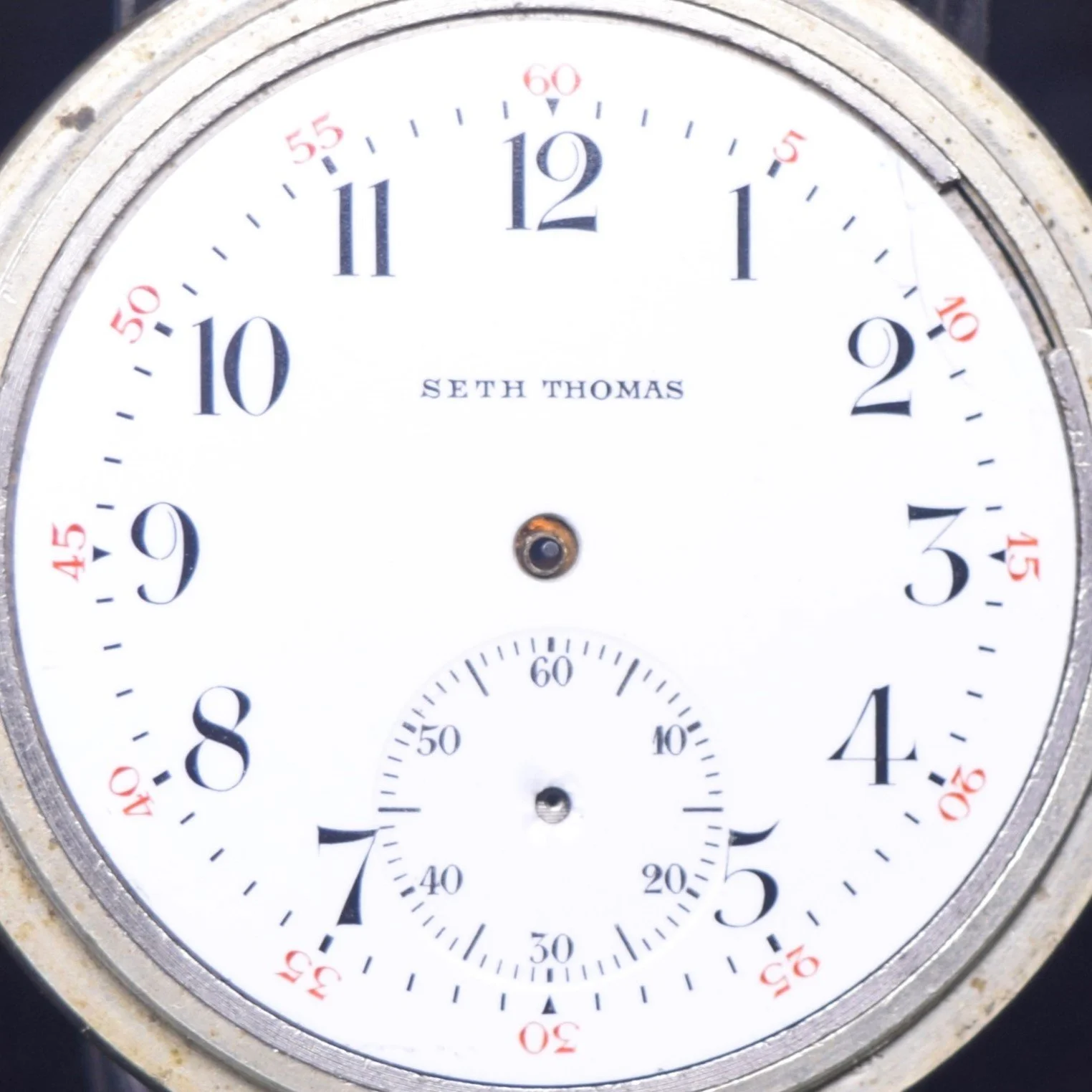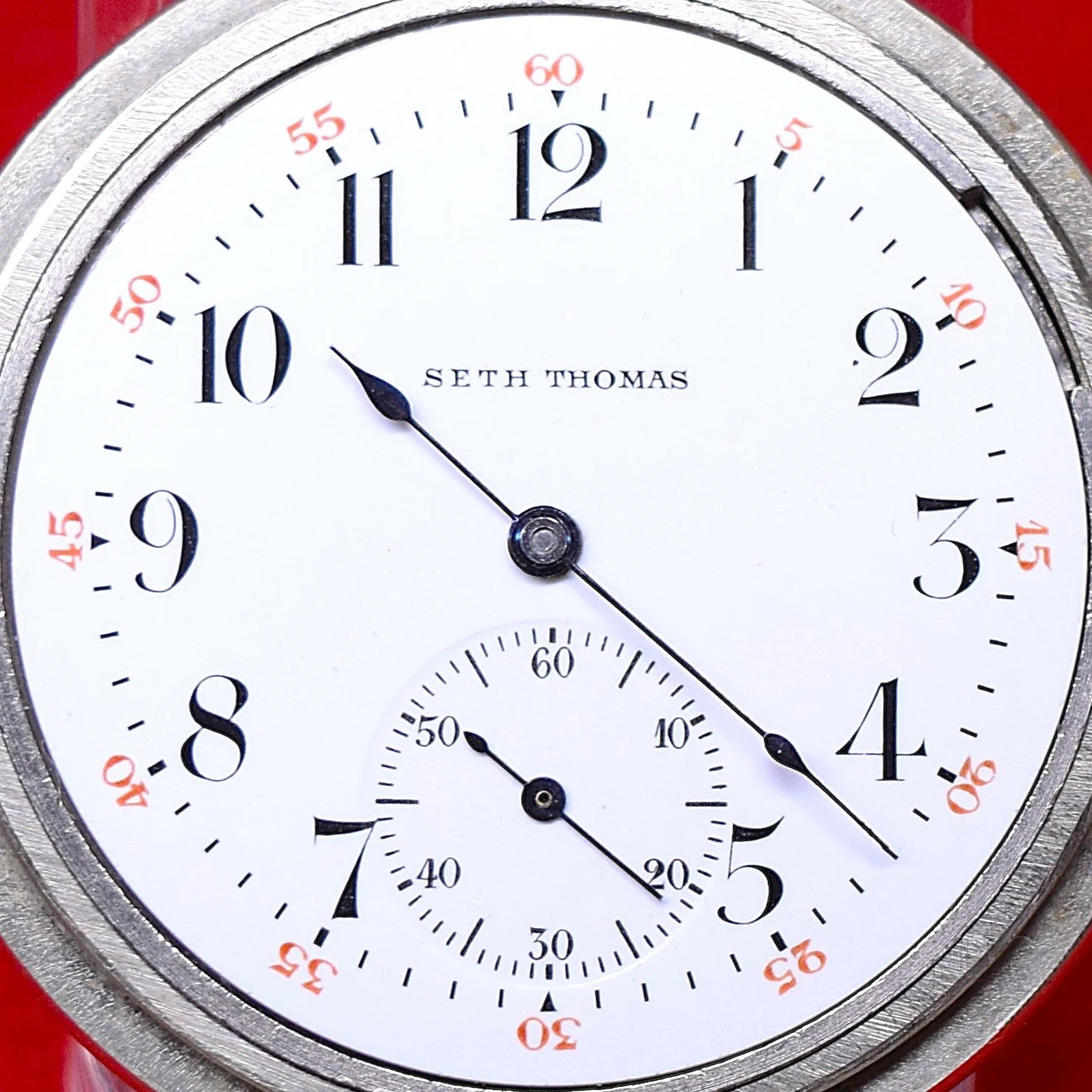 The movement presents with a 12-size Seth Thomas Arabic dial with a hash marks minute track and red five-minute marginals, fitted with Seth Thomas #1277 blued spade & whip hands 12-size.