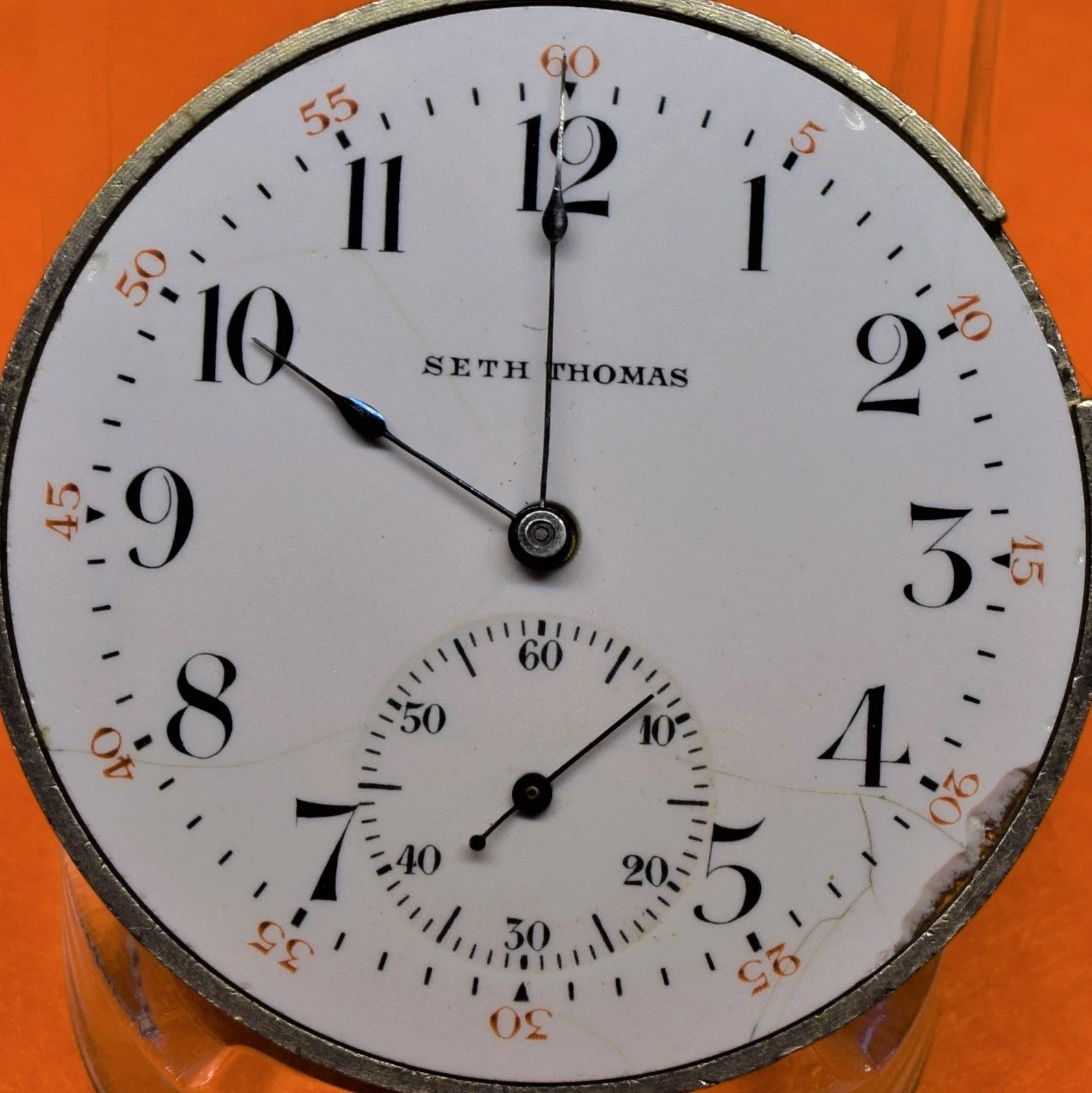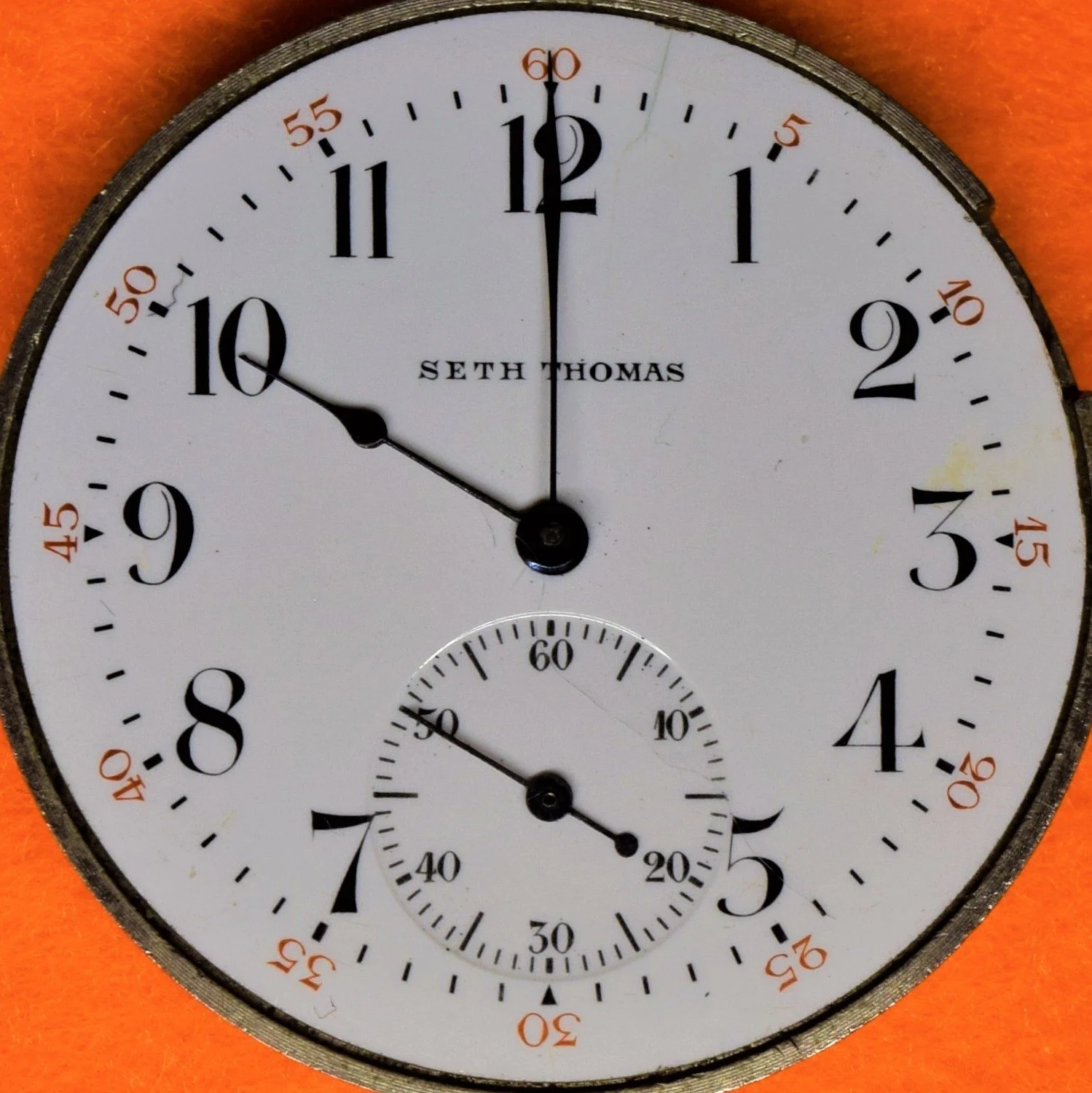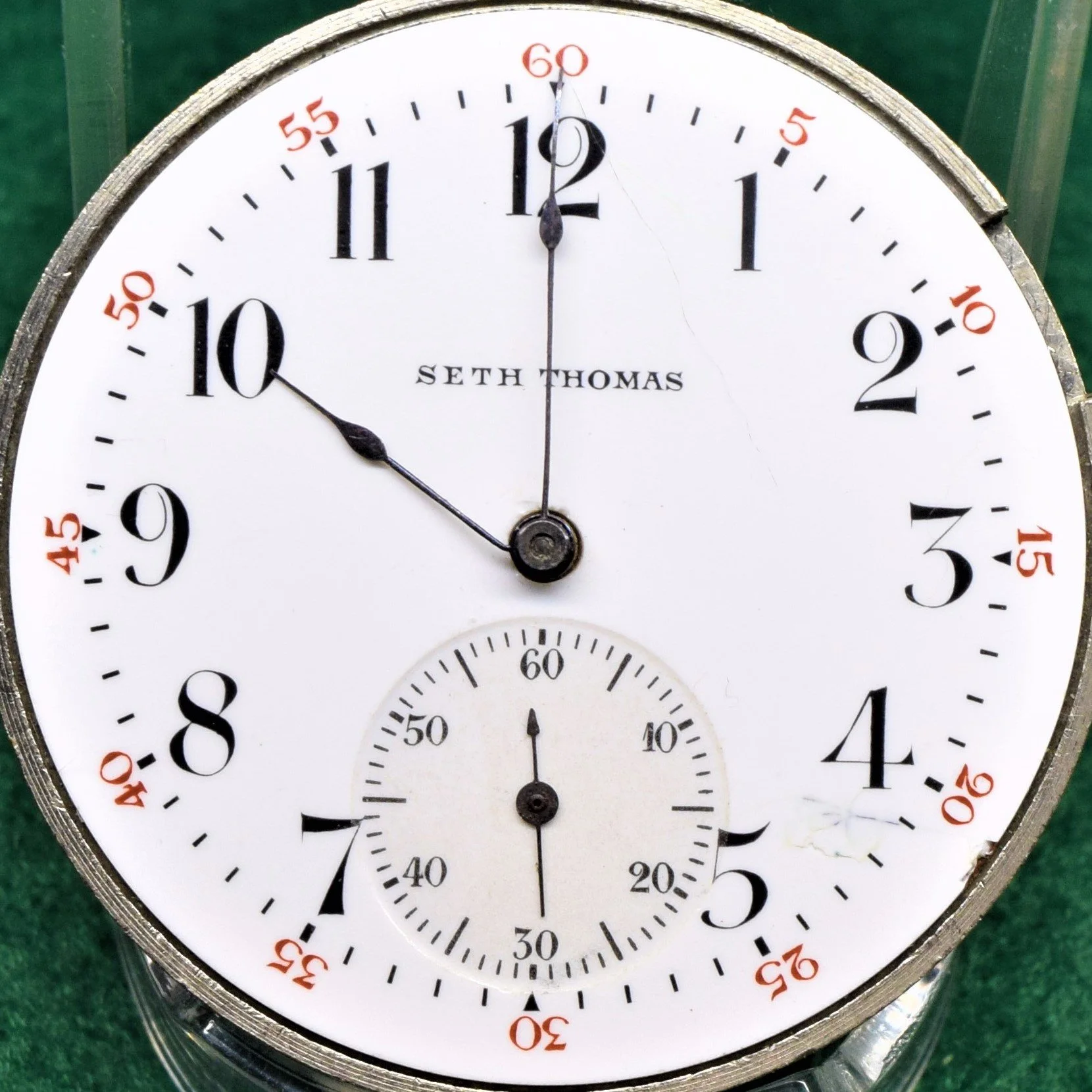 The movement presents with a 12-size Seth Thomas Arabic dial with a hash marks minute track and red five-minute marginals, fitted with Seth Thomas #1277 blued spade & whip hands 12-size.