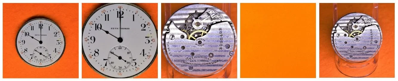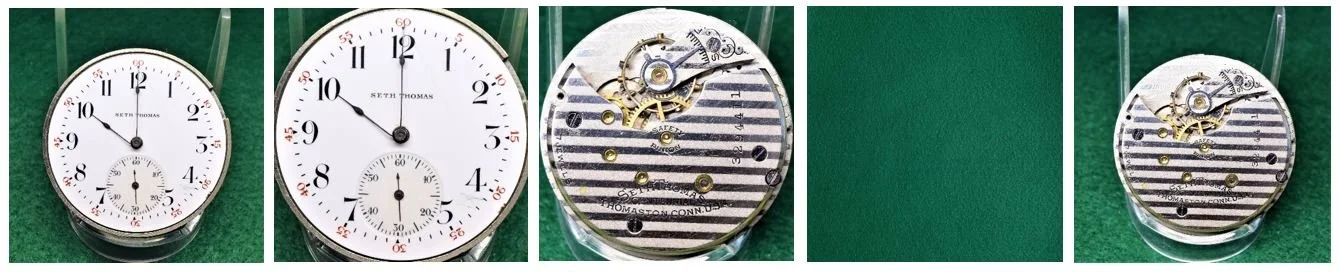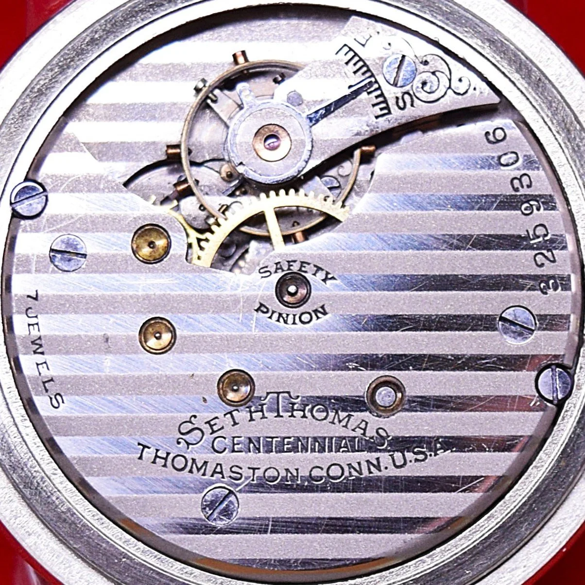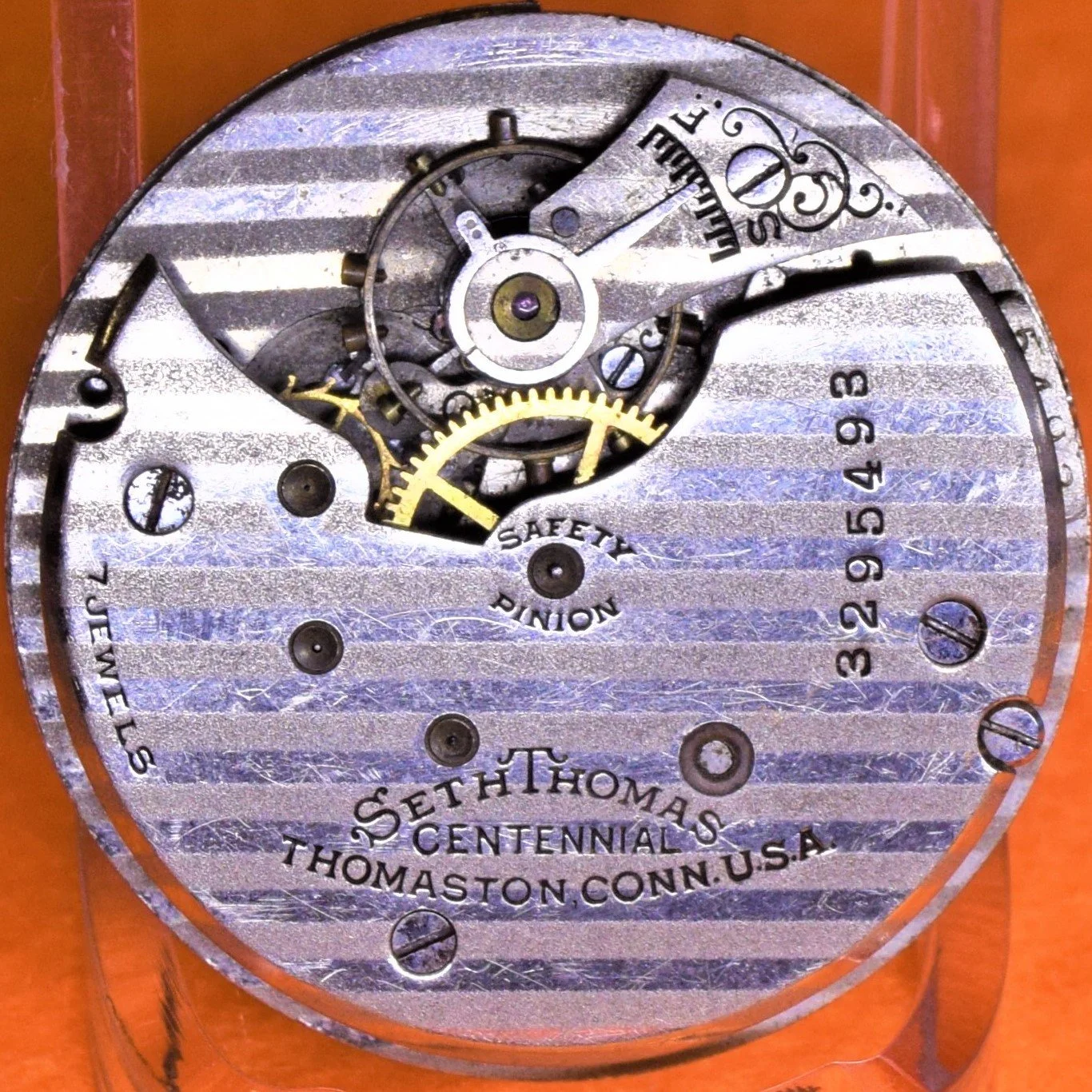 This 1914 Seth Thomas 12-size hunting Model 22 pocket watch was manufactured with a nickel finished 3/4 plate, 7 jewels, and it is non-adjusted. The movement is stem wound and pendant set, with a Breguet hair spring, and plain/simple regulator. Its serial number is 3295493, and its grade is Seth Thomas named grade Centennial. The movement is signed “Seth Thomas Centennial Thomaston, Conn.”.