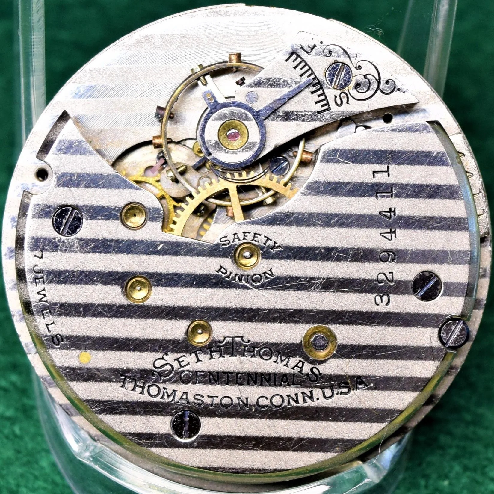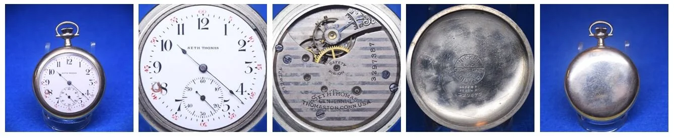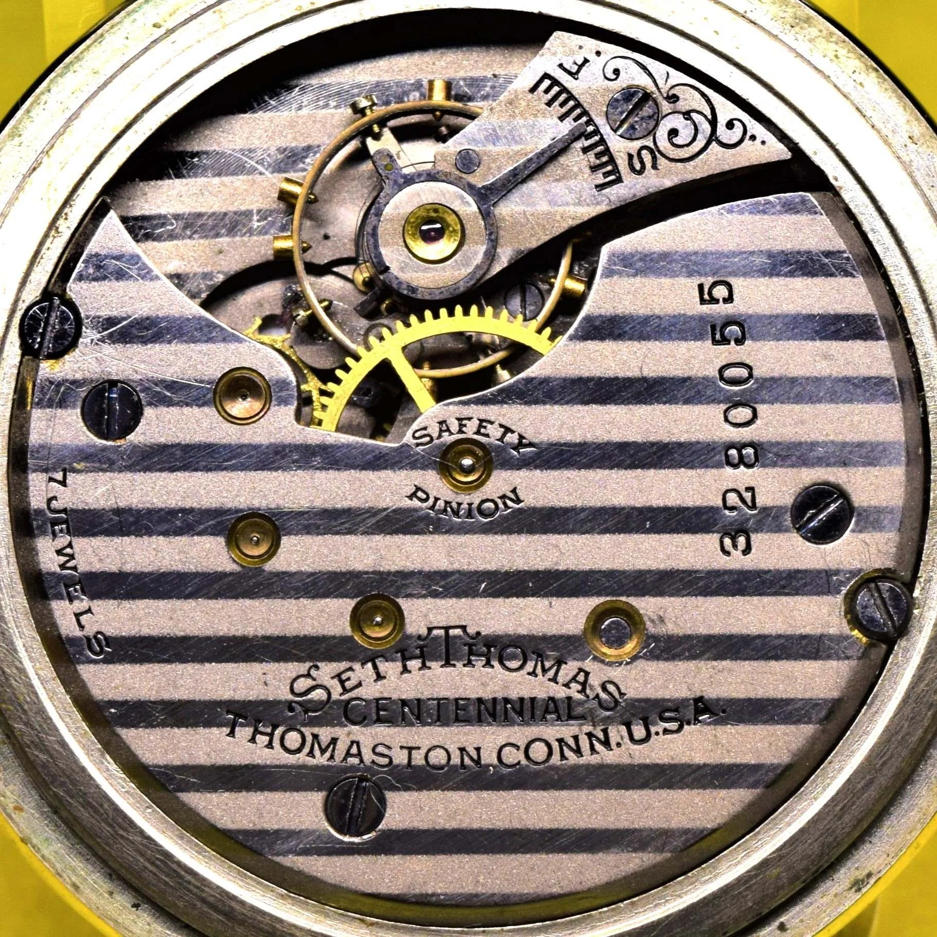 This 1914 Seth Thomas 12-size hunting Model 22 pocket watch was manufactured with a nickel finished 3/4 plate, 7 jewels, and it is non-adjusted. The movement is stem wound and pendant set, with a Breguet hair spring, and plain/simple regulator. Its serial number is 3291462, and its grade is Seth Thomas named grade Centennial. The movement is signed “Seth Thomas Centennial Thomaston, Conn.”.