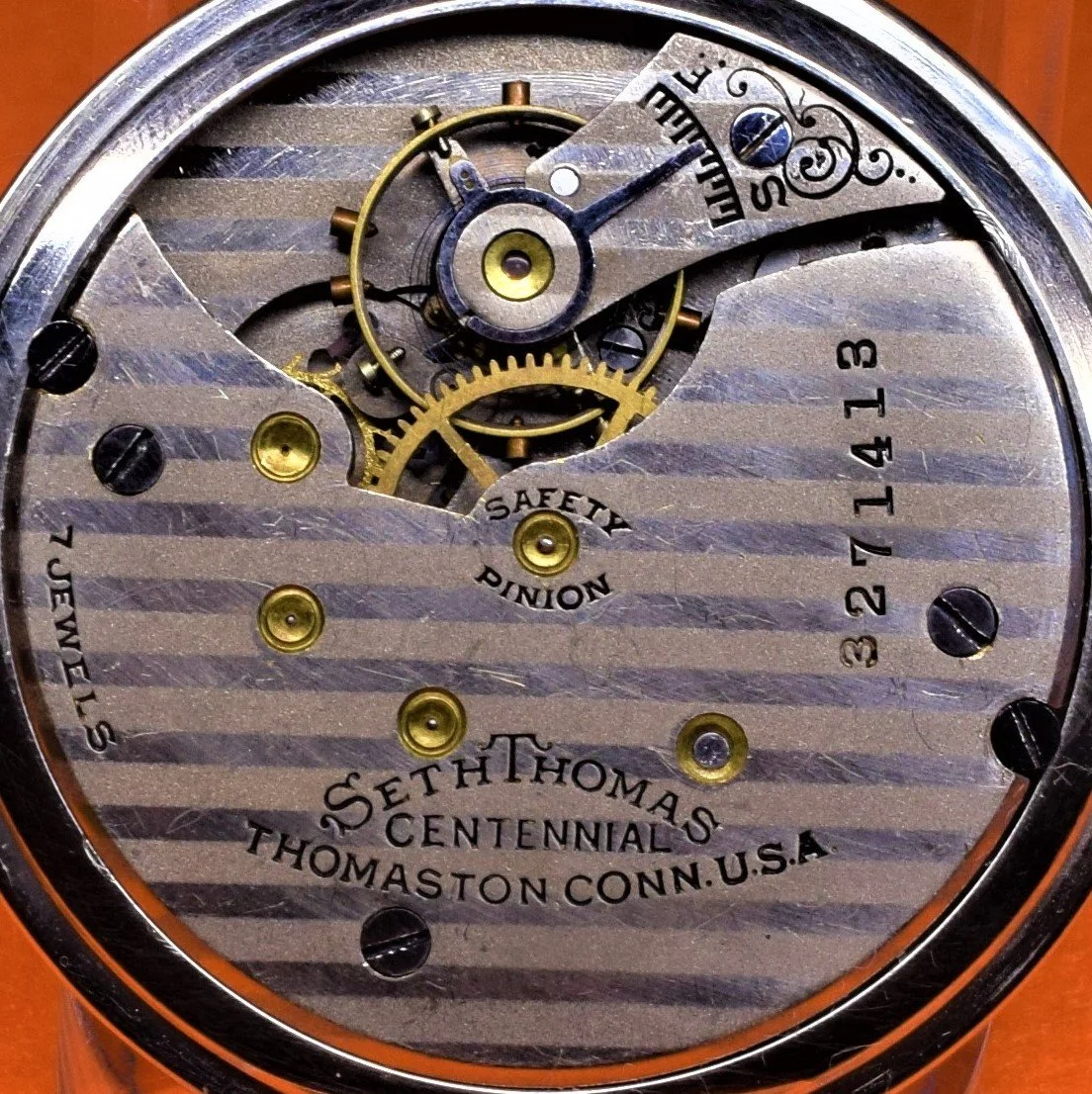 This 1912 Seth Thomas 12-size hunting Model 22 pocket watch was manufactured with a nickel finished 3/4 plate, 7 jewels, and it is non-adjusted. The movement is stem wound and pendant set, with a Breguet hair spring, and plain/simple regulator. Its serial number is 3271413, and its grade is Seth Thomas named grade Centennial. The movement is signed “Seth Thomas Centennial Thomaston, Conn.”.
