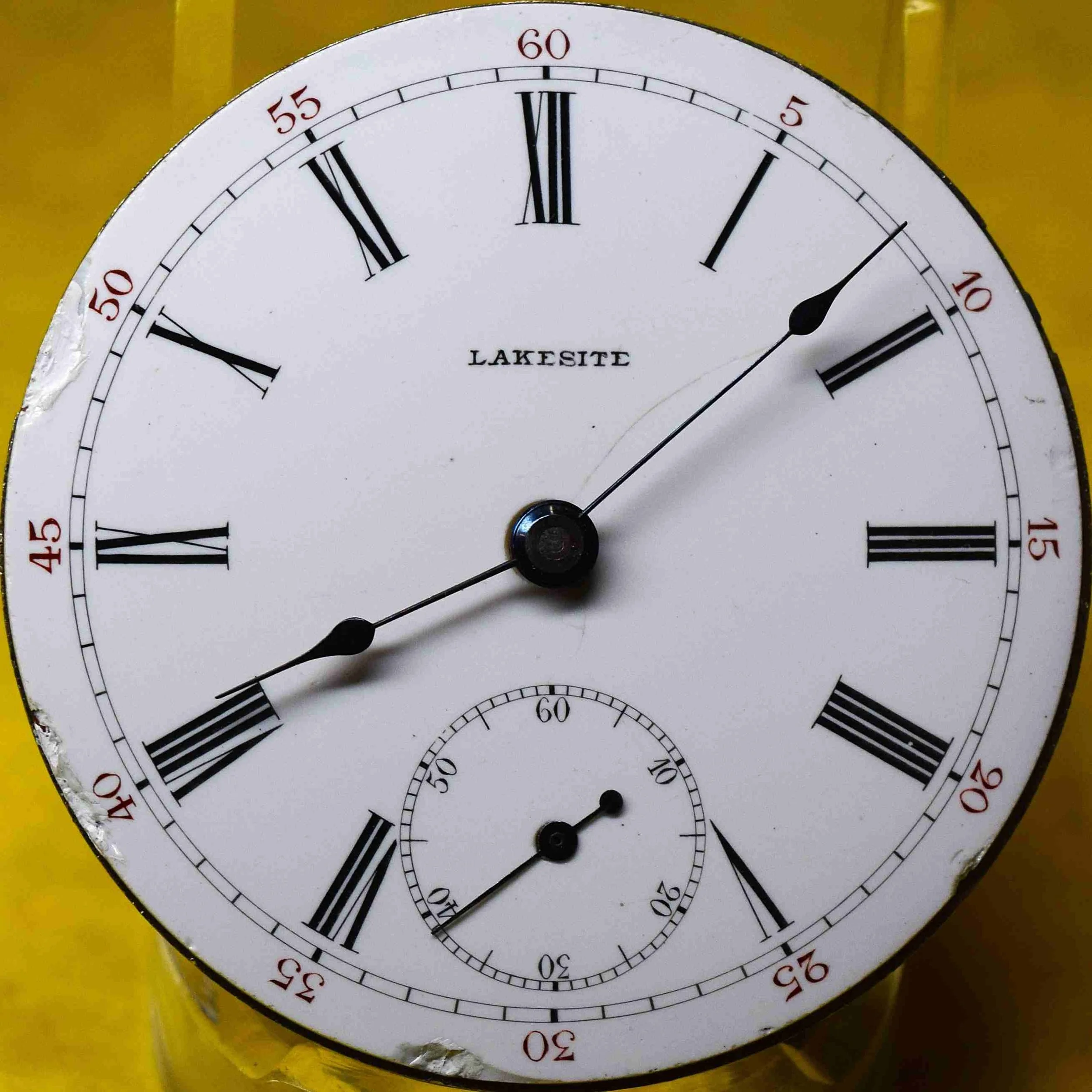 The movement presents with a private label "Lakesite" Roman dial with a ring minute track and red five-minute marginals, fitted with Seth Thomas #1281 blued spade hands. [1.h]