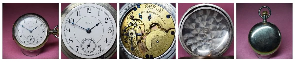 The Earle Watch Company also contracted with Illinois Watch Company to produce its Earle Watch Company pocket watch in an 18-size Railroad Grade with 21 ruby jewels, nickel finish, and micrometric regulator, that was stem wound, lever set, and adjusted. It was Illinois Watch Company Model 6 with a full plate.