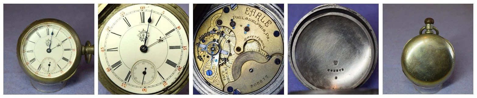 The Earle Watch Company private label pocket watches were manufactured by Seth Thomas for William G. Earle, a Philadelphia jeweler born in 1850, whose store was first located at 13 N. 9th Street and later at 1030 Market Street, from 1881 until his death in 1915. William G. Earle served as a Carrier for the U.S. Postal Service from 1871-1887, prior to becoming a jeweler.