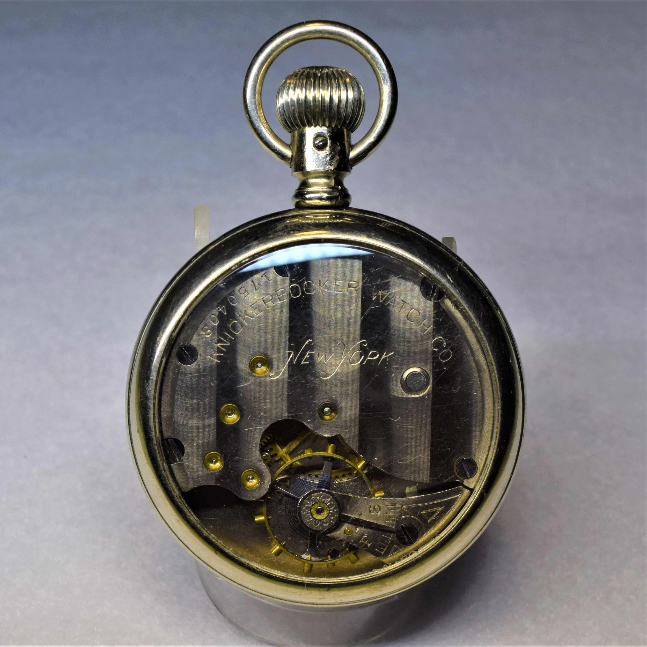 The movement is presently cased in an open-face 18-size Stirling Silver pocket watch case of unknown manufacturer, with hinged back and bezel. The case’s serial number is 98340.