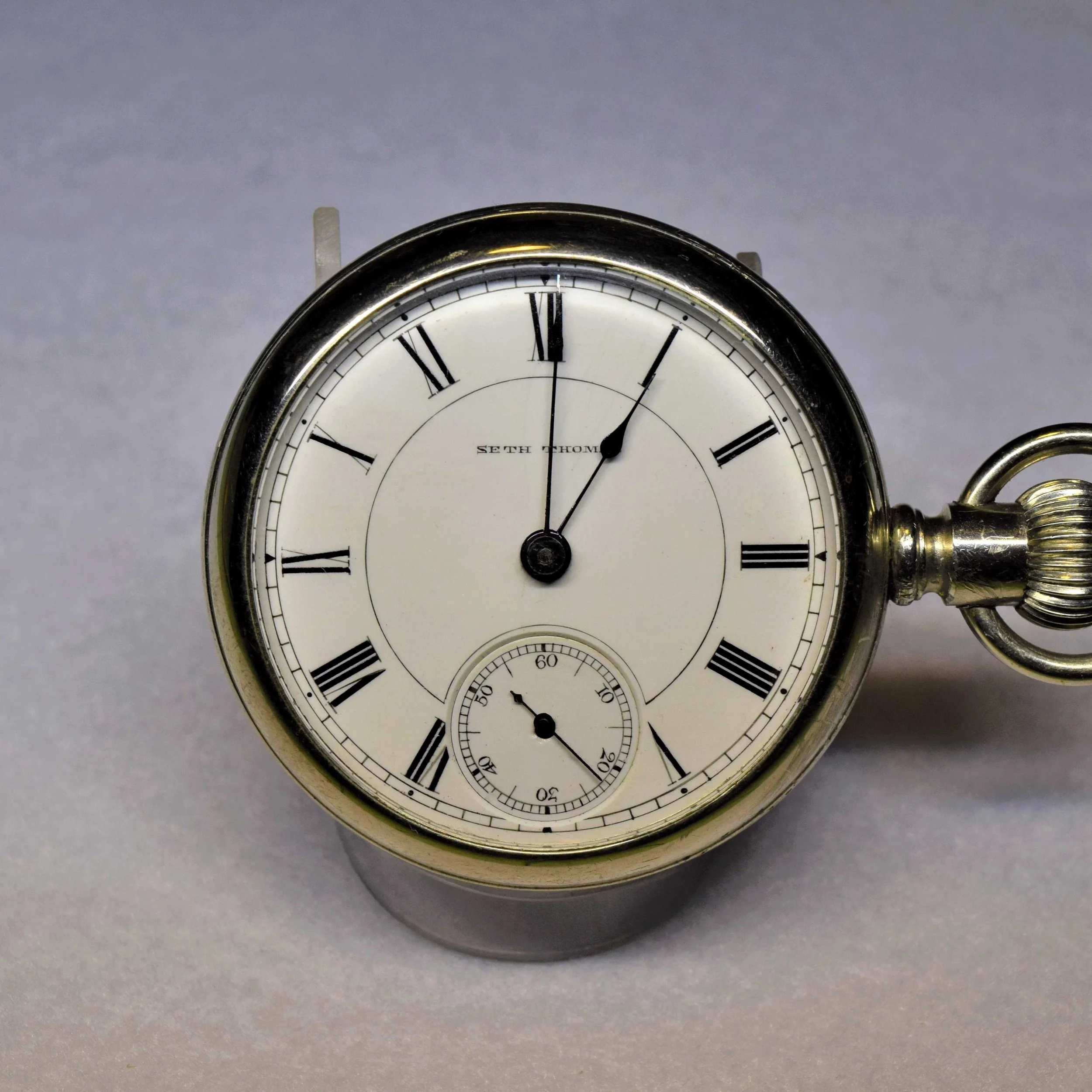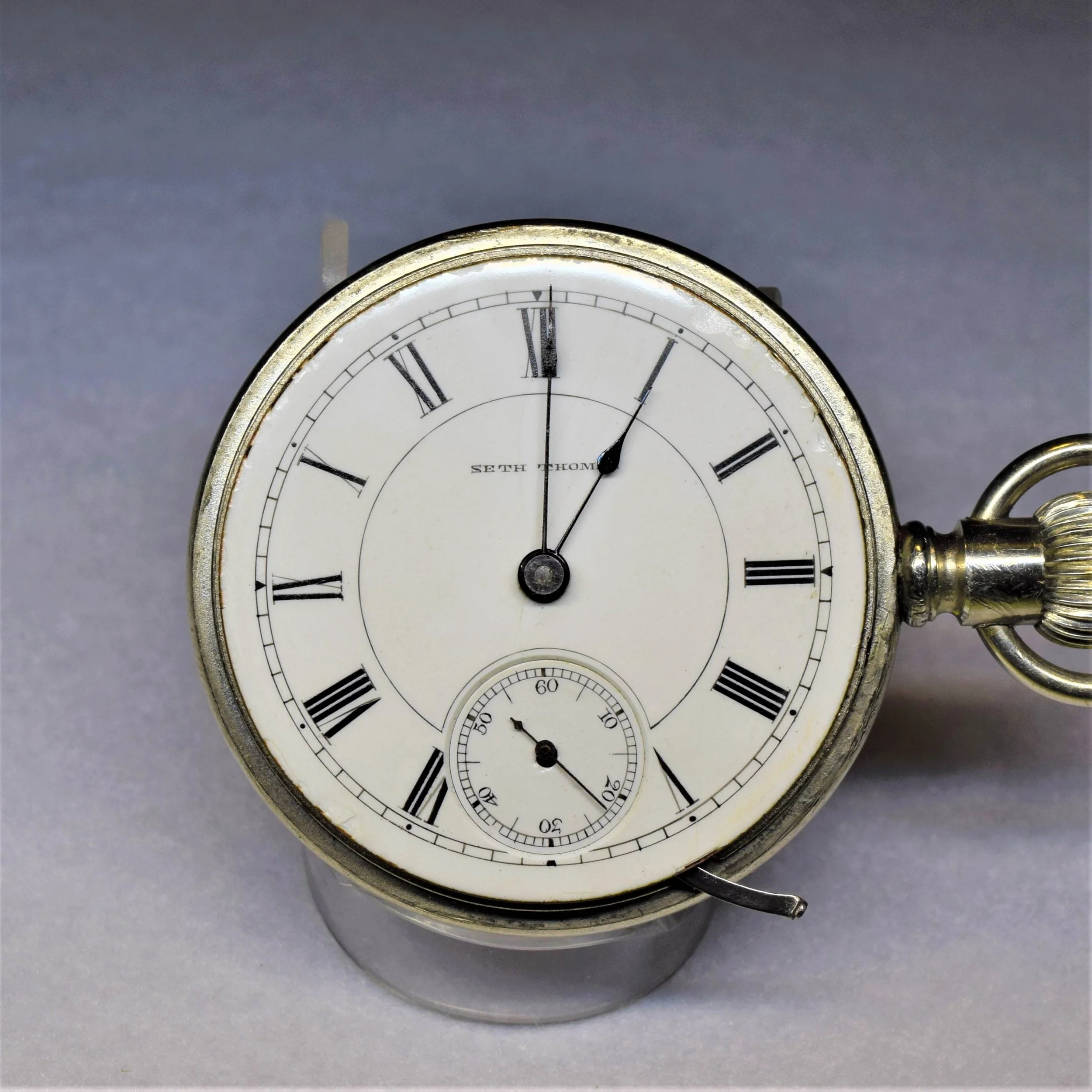 This 1914 Seth Thomas open-face 18-size Model 8 pocket watch was manufactured with a nickel finished 3/4 plate, 7 jewels, and it is non-adjusted. The movement is stem wound and lever set, with a Breguet hair spring, and micrometric regulator. Its serial number is 2518999, and its grade is Seth Thomas numbered grade 36. The movement is signed “Seth Thomas Thomaston, Conn.”.