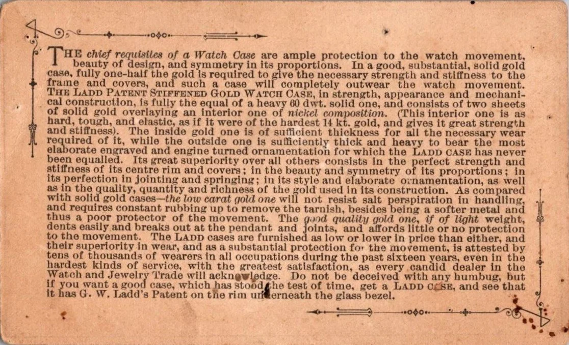 The Paired open-face pocket watch case is a delight to behold, beautiful and eminently functional. The bezel is hinged from the outer case providing easy access to the setting lever. Having removed the inner case access to the movement is gained by swinging the hinged back cover open. The case is shown below as marketed by the Chicago wholesale house, Lapp & Flershem, the “Busiest House in America” in their 1887 Illustrated Catalogue.