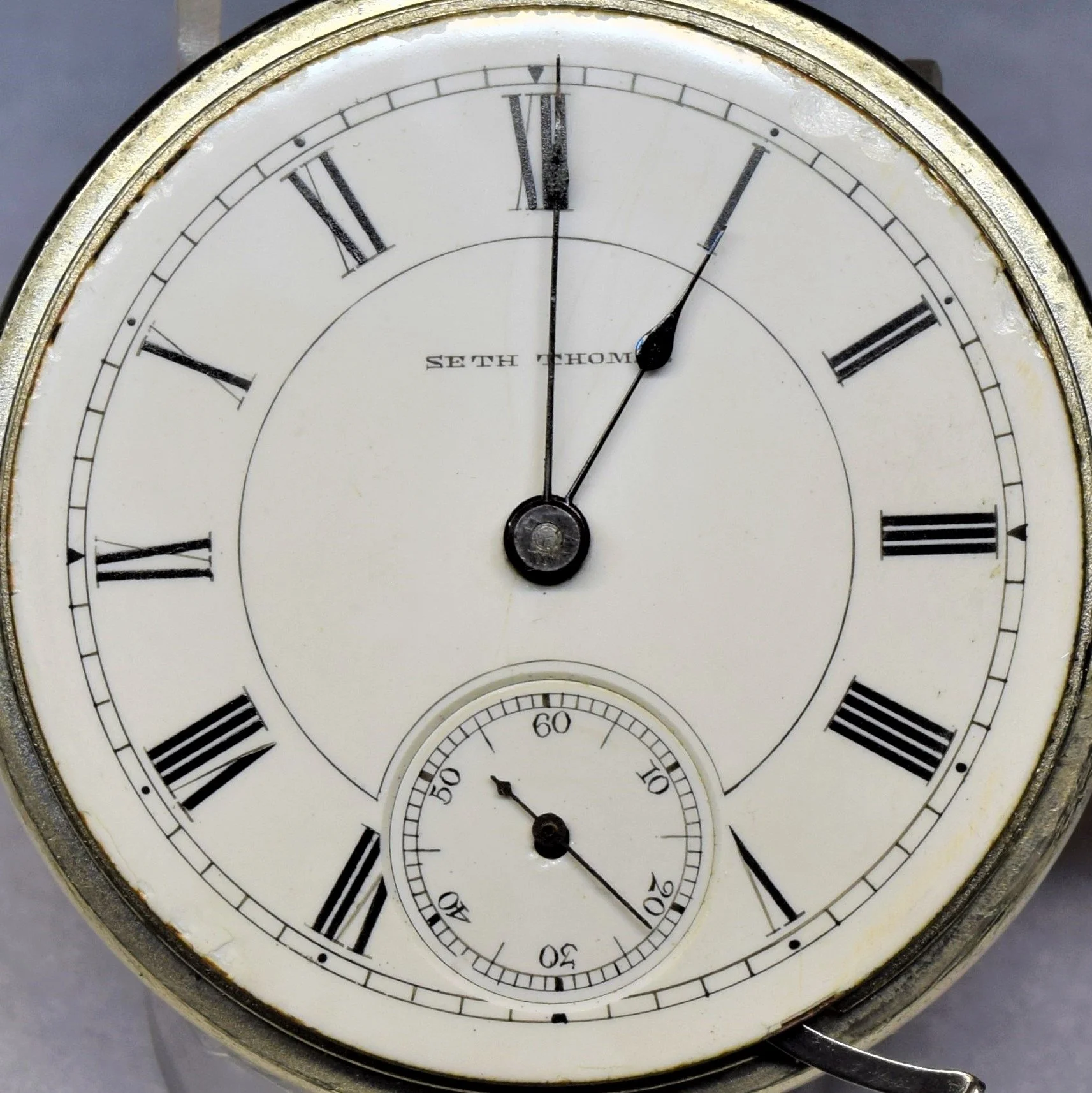 The movement presents with a special Tourist 16-size Seth Thomas Arabic conversion dial with a hash marks minute track and no marginals, fitted with Seth Thomas blued spade hands 16-size. This dial converts the appearance of the movement to look like an up-side-down open-face movement with the winding stem at the 6:00 o’clock position for use in the Seth Thomas Tourist travel timepiece. Dial feet are placed at approximately 5 minutes, 16 minutes, and 43 minutes; placing the pendant at 6:00 instead of 12:00.