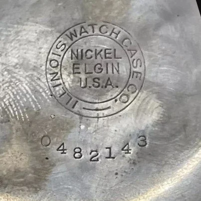 The watch is cased in a 12-size Illinois Watch Case Company open-face Nickel Silver (nickel) watch case with screw back and bezel, serial number 120870.
