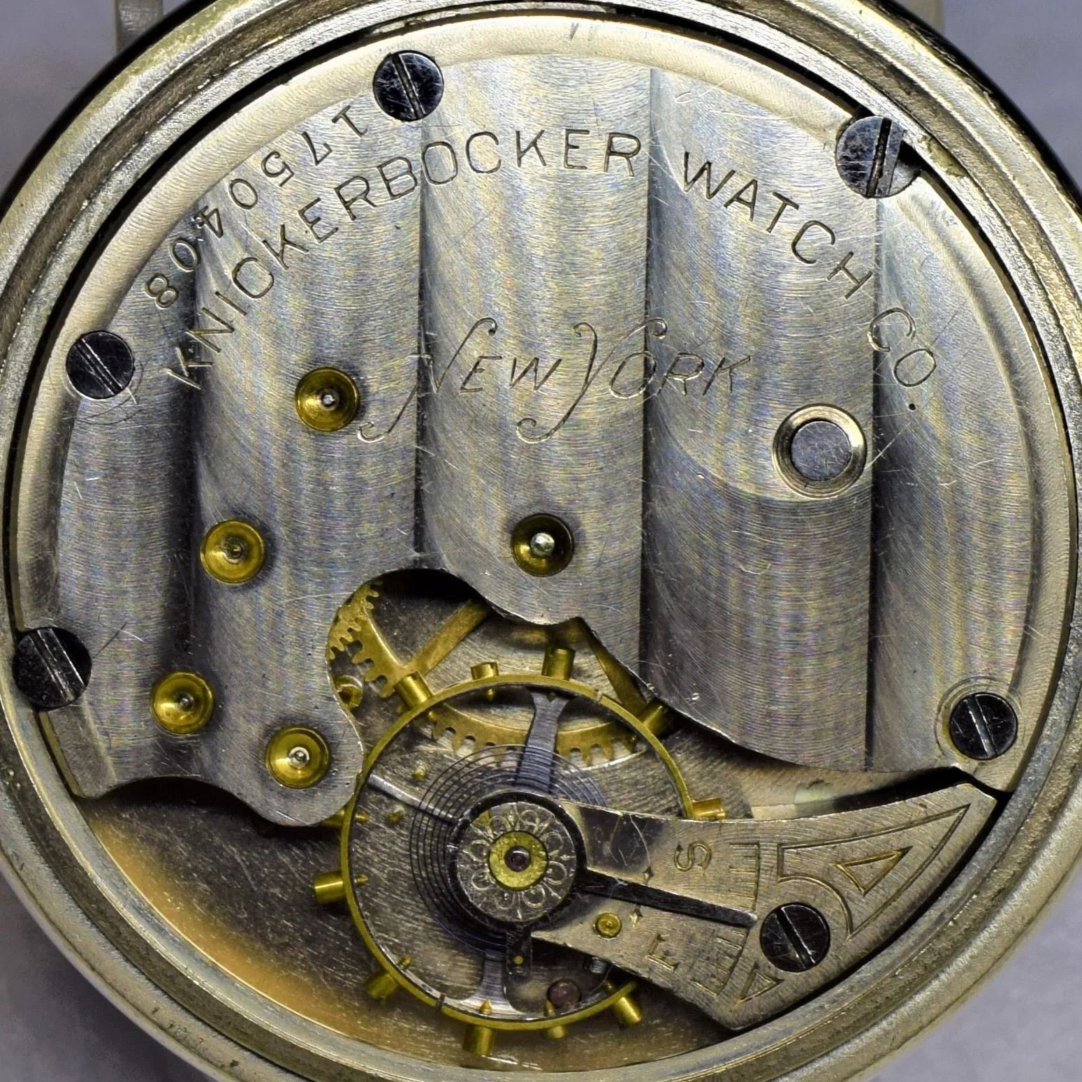 The movement presents with an 18-size Seth Thomas Roman dial with a ring minute track and no marginals; fitted with Seth Thomas #1281 blued spade hands 18-size. Knickerbocker Watch Co. is a private label in Seth Thomas Model 12, Model 13, Model 18, and Model 24. The original Knickerbocker Watch Co. dial is missing.