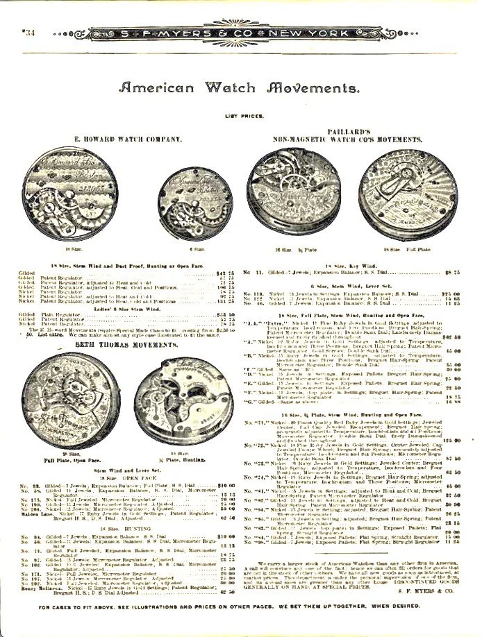Overview of Seth Thomas Pocket Watches Characteristics of Seth Thomas Pocket Watch Models Named Grades, Private Labels, and Special Use Timepieces Records, Research, and Sources of Information Sizes and Models, Winding and Setting Movement Finishes Seth Thomas Pocket Watch Dials & Hands Larkin Company Butler Brothers C.H. Knights J.M. Smyth and Co. Lapp and Flershem Sears, Roebuck Co. S.F. Myers Cash Buyers' Union Pocket Watch Cases Seth Thomas Ephemera S.F. Meyers & Co. Information from Wholesale, Retail, and Manufacturer’s Catalogs A.C. Becken Brooks Optical Co. Hofman Jewelry Co. Holsman and Alter J.H. Purdy Montgomery Ward N. Shure Young & Co. Seth Thomas Pocket Watch Dbase Roy Ehrhardt 1894 Advertisement 1912 Catalog Overview of Seth Thomas Pocket Watches Characteristics of Seth Thomas Pocket Watch Models Named Grades, Private Labels, and Special Use Timepieces Records, Research, and Sources of Information Sizes and Models, Winding and Setting Movement Finishes Seth Thomas Pocket Watch Dials & Hands Larkin Company Butler Brothers C.H. Knights J.M. Smyth and Co. Lapp and Flershem Sears, Roebuck Co. S.F. Myers Cash Buyers' Union Pocket Watch Cases Seth Thomas Ephemera S.F. Meyers & Co. Information from Wholesale, Retail, and Manufacturer’s Catalogs A.C. Becken Brooks Optical Co. Hofman Jewelry Co. Holsman and Alter J.H. Purdy Montgomery Ward N. Shure Young & Co. Seth Thomas Pocket Watch Dbase Roy Ehrhardt